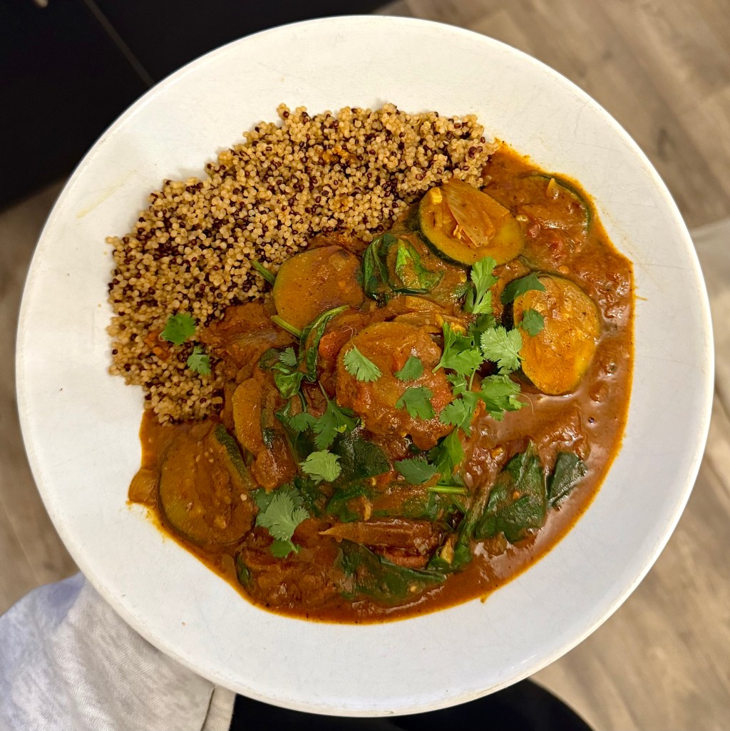 - Then pour in some coconut milk. However much you like really, I don’t use a lot because I like a good level of spice. Add a bit and taste once it’s mixed in and you’ll know if you need more